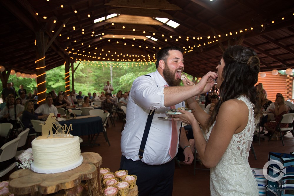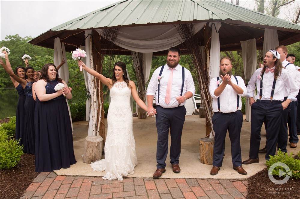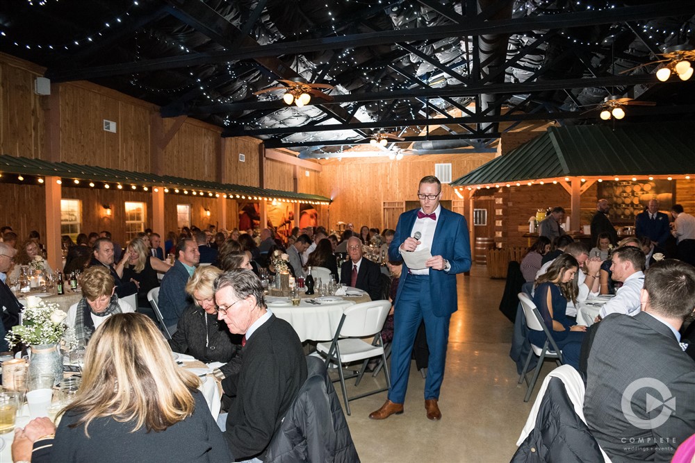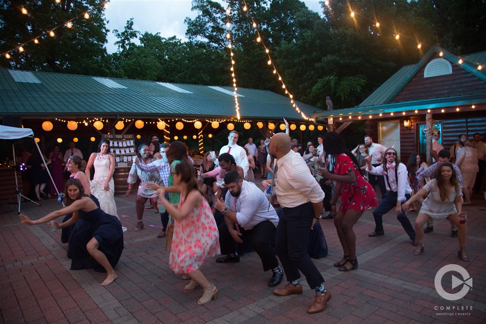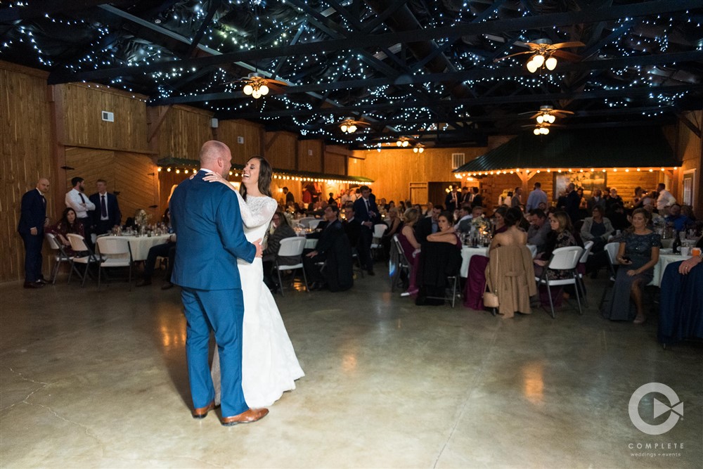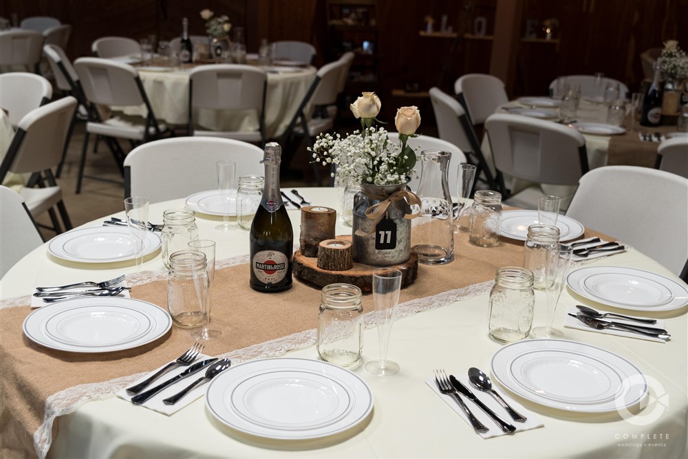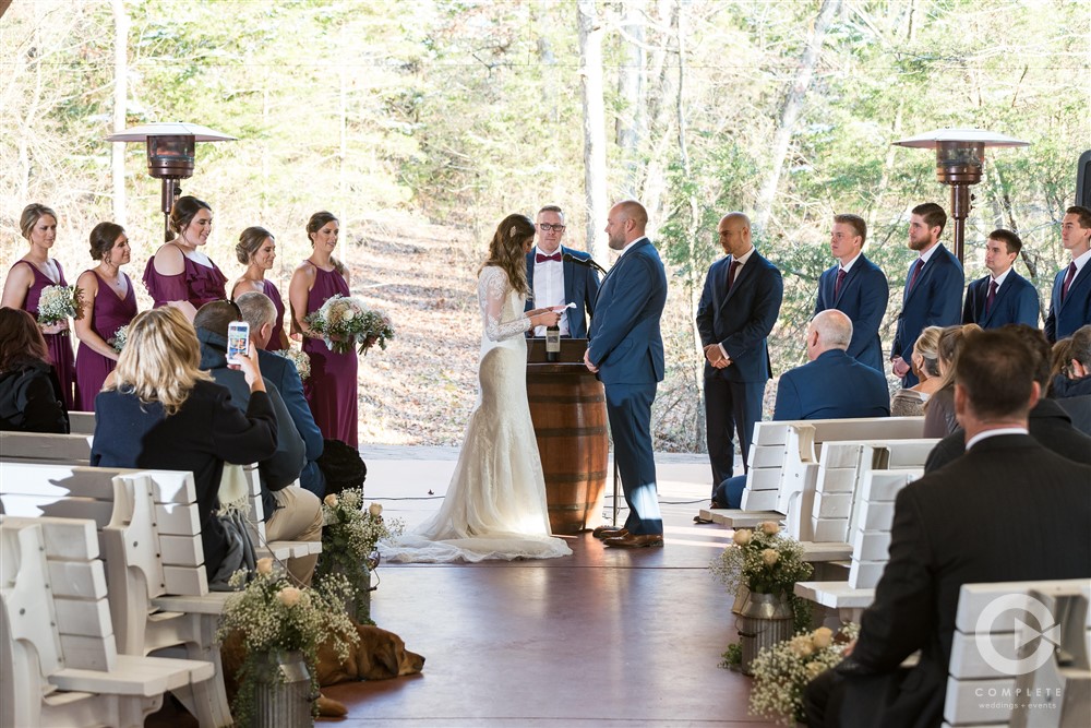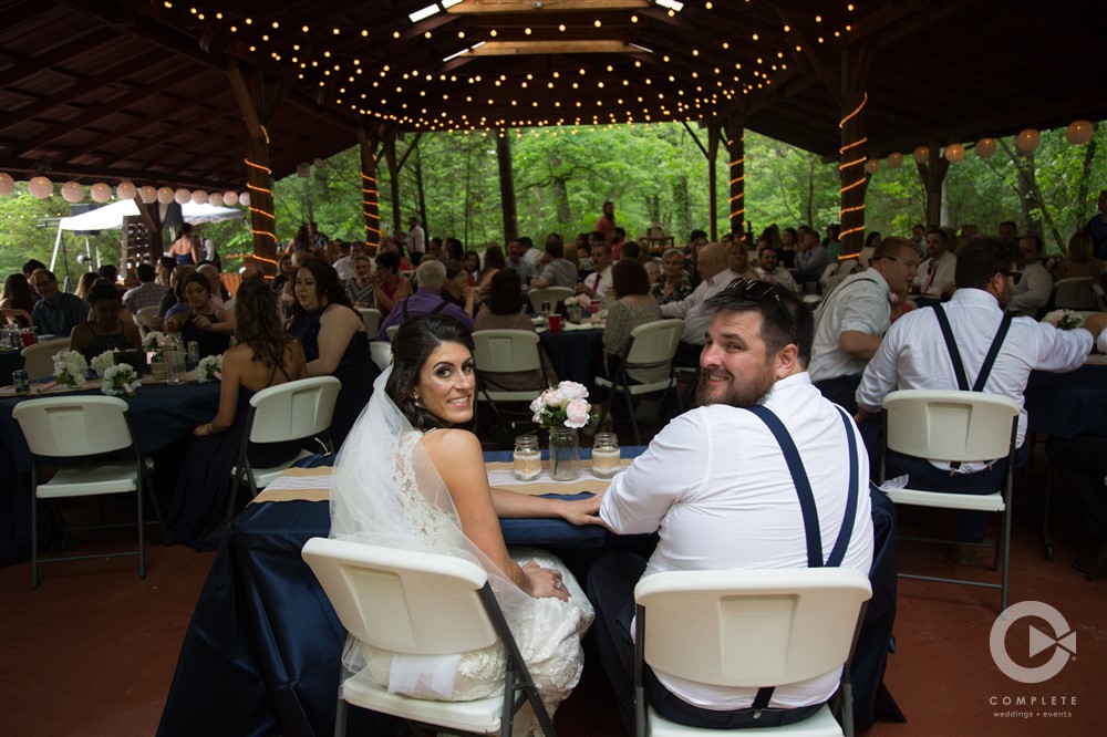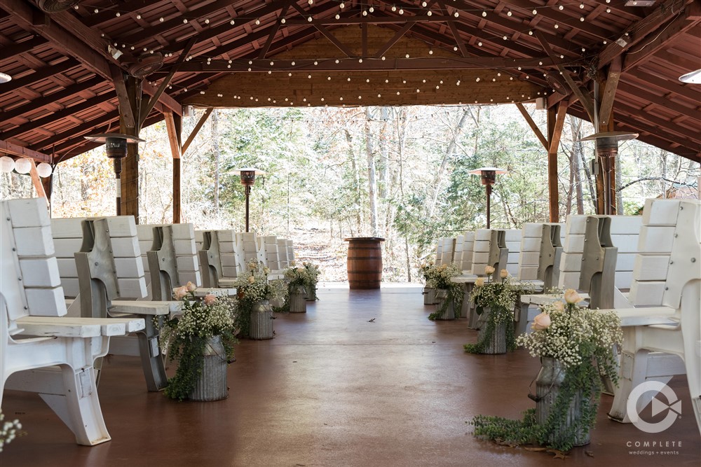 Included in our rental fee is two night’s lodging, Friday and Saturday, for up to 12 guests. We have three rooms in our private log cabin which sleeps up to six people and three rooms in the lodge which also sleeps up to six people. All bedrooms have queen size beds. Our great room in the lodge is ideal for small gatherings and is a perfect staging area for ceremonies. Guest restrooms are available at both the pavilion and the barn. Parking is a short walk up a brick pathway to the pavilion and patio area. Parking lot attendants are available prior to your ceremony. We provide 60” round tables and matching white chairs for your guests up to 200 persons. We also have plenty of long banquet tables to accommodate a head table, gift table, etc. There are prep rooms for caterers in the Lodge and in the Barn with refrigerators to accommodate their items.
